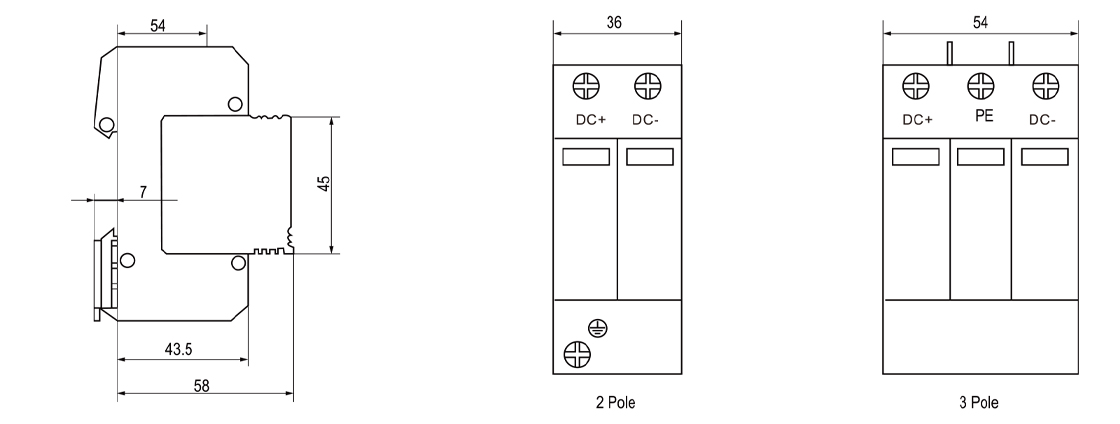 Surge protective device, protect against lightning surge voltages in solar system (photovoltaic power supply system). These units must be installed in parallel on the dc networks to be protected and provide common and different modes protection. Its installed location are recommended at both ends of the dc power supply line (solar panel side and inverter/converter side), especially if the line routing is external and long. High energy MOVs equipped with specific thermal disconnectors and related failure indicators.